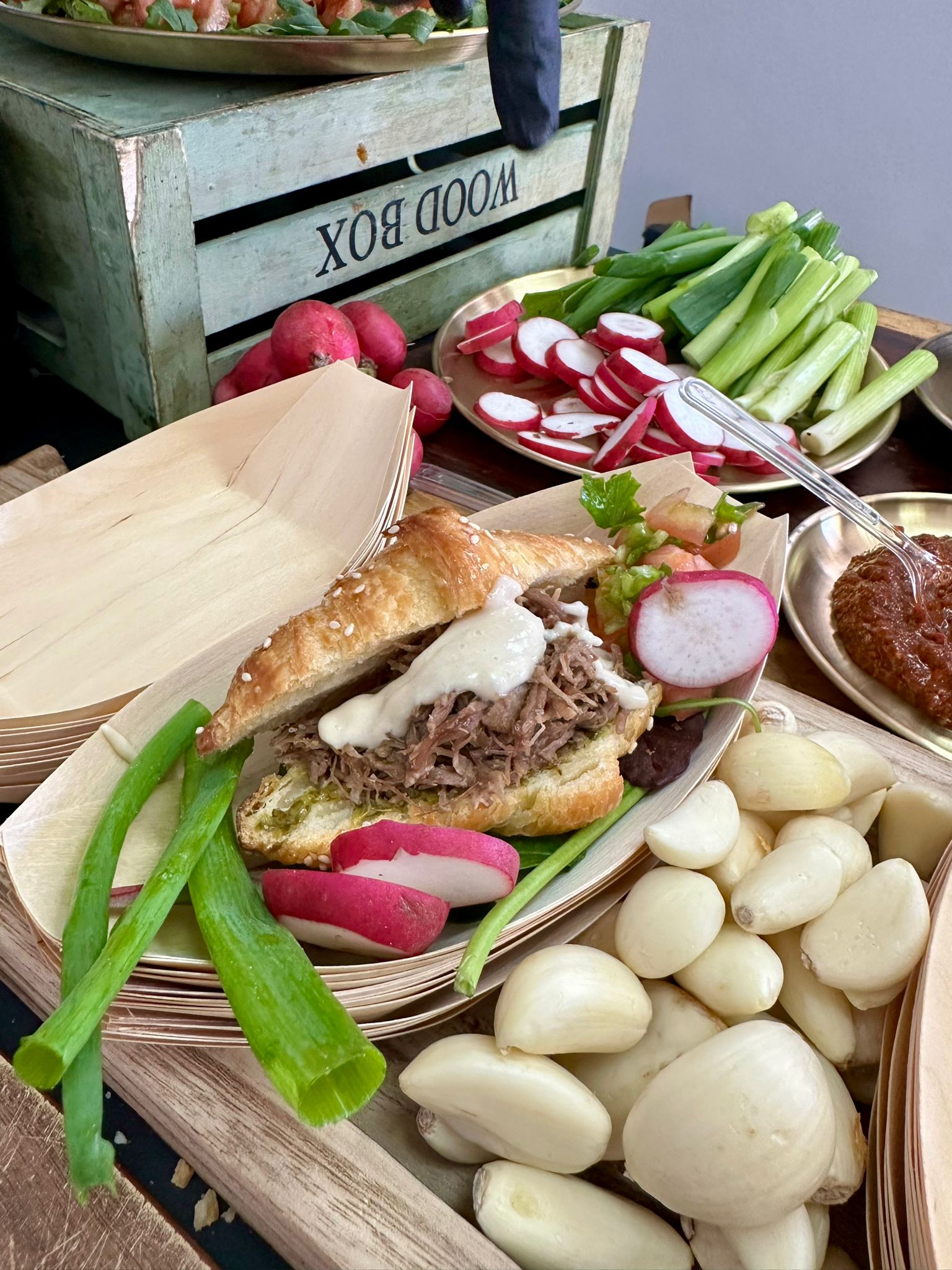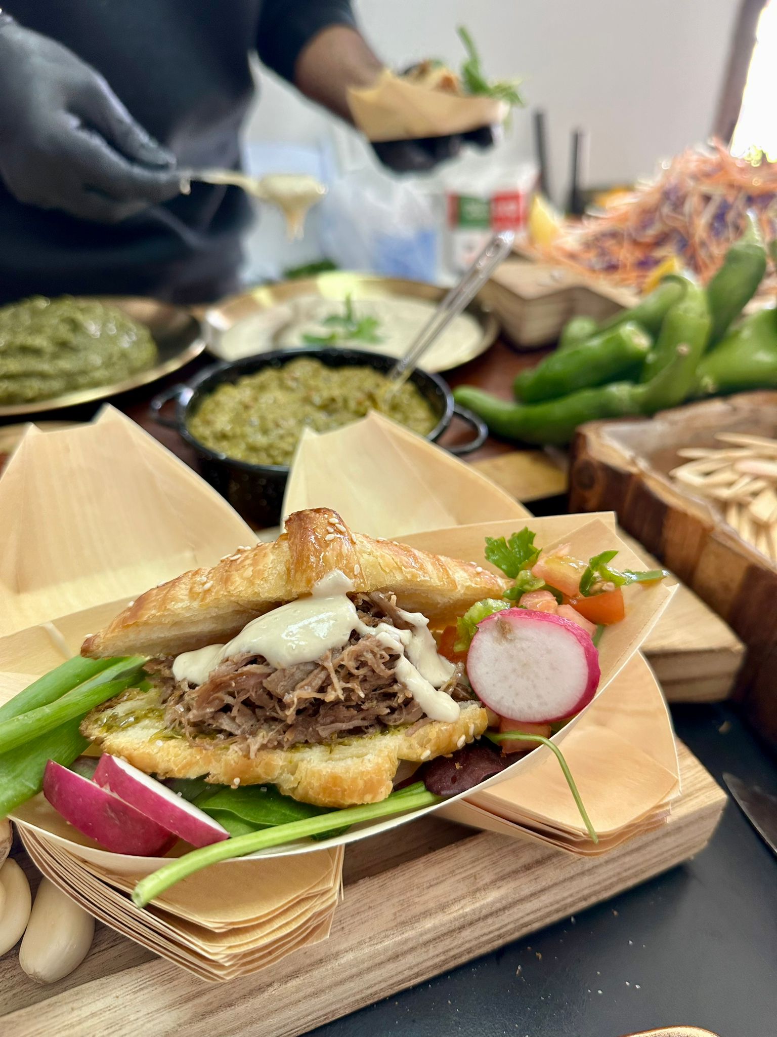 לצד הקרואסון מוגשים סלט עגבניות פיקנטי, ירקות שורש קלויים ומבחר רטבים מוקפדים: אריסה חריפה לאוהבי הטעמים הנועזים, פסטו ירוק ורענן, צ'ימיצ’ורי קלאסי שמוסיף חמיצות מרעננת, וטחינה ביתית קרמית שמאזנת את הטעמים. כל אורח יכול להרכיב את הצלחת או את הקרואסון שלו בדיוק לפי טעמו האישי.