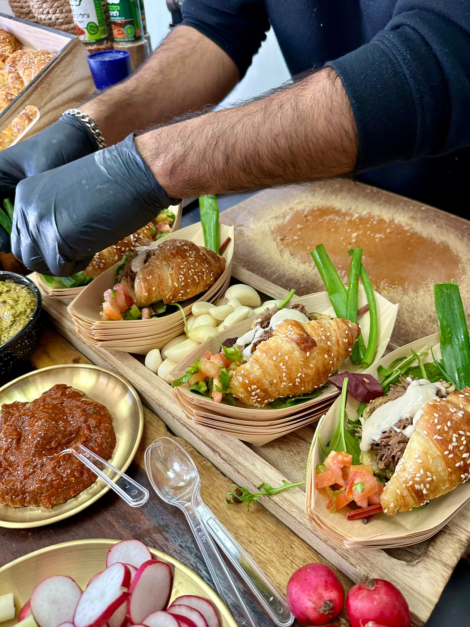 הביס הראשון כבר עושה את כל ההבדל – השילוב של המאפה הרך והפריך עם הבשר המתובל יוצר תחושה של מנות גורמה יוקרתיות, אך באווירה קלילה ונגישה שמתאימה בדיוק לאירועים. כל קרואסון נחתך ונמלא במקום, מול עיני האורחים, כך שהחוויה מתחילה עוד לפני שטועמים – עם ריח משגע, נראות מגרה והתרגשות של ציפייה.